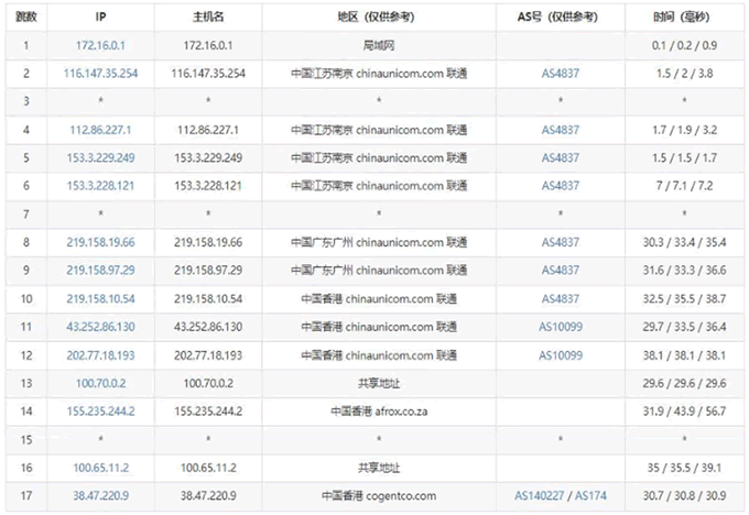聯通回程路由是從香港直連回到國內網口,走的AS4837線路。
