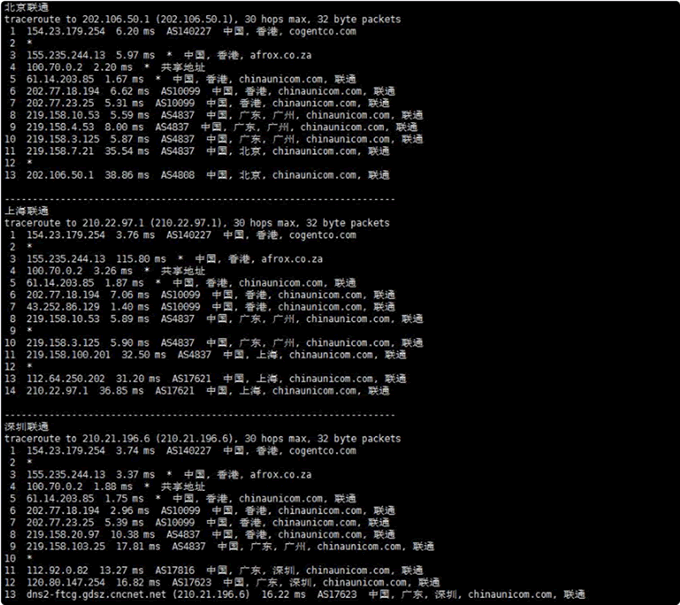 聯通去程路由是從廣州網口出去,然后直連香港機房,走的是AS4837線路。