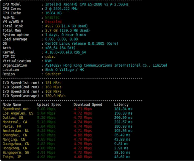 可以看到服務器使用的是英特爾E5-2680 V3的處理器,主頻是2.5GHz,磁盤IIO在159MB/秒,這個性能還是相當不錯的。