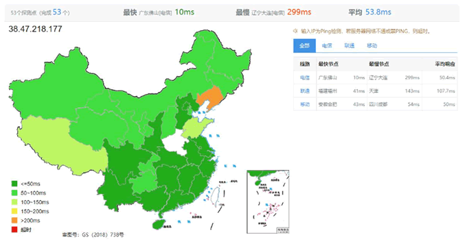 全國三網Ping的平均延遲在53ms左右,其中電信網絡50ms,聯通網絡107ms,移動網絡50ms。