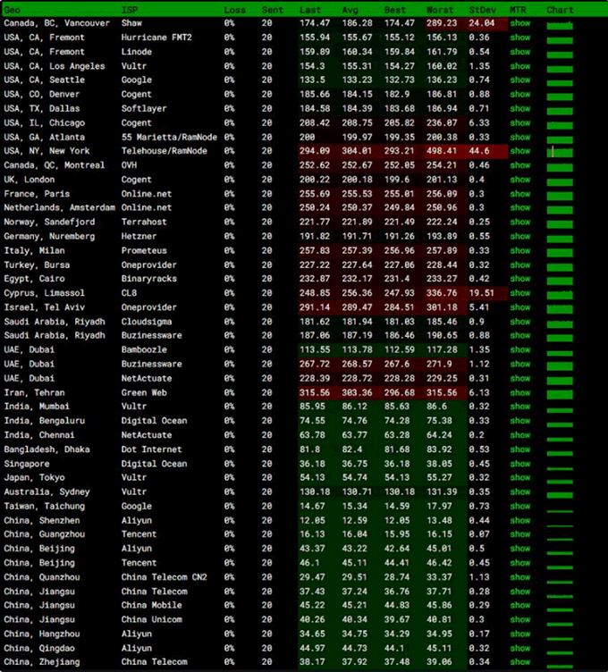 可以看到全球各節點網絡穩定性還是相當不錯的,不管是國內還是國外基本都沒有丟包的情況,亞洲地區延遲都在100ms以內。