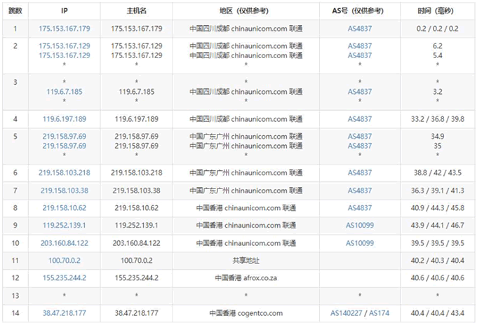 聯通去程路由是從廣州網口出去,然后直連香港機房,走的是AS4837線路。
