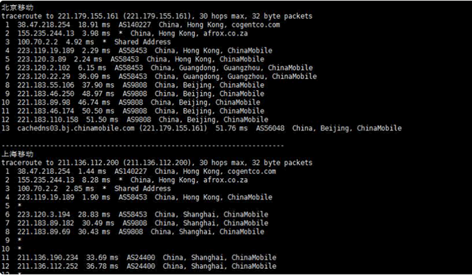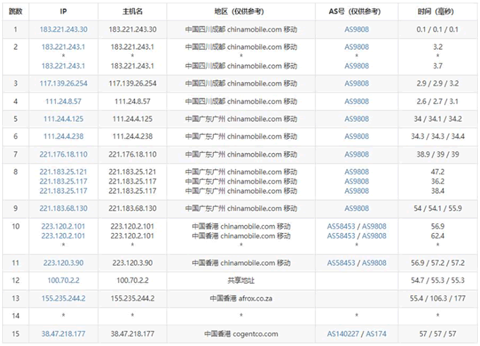 移動去程路由是從廣州網口出去,然后直連香港機房,走的是移動CMI線路。