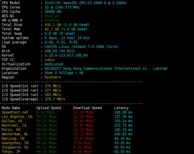 可以看到這款香港服務器使用的2.2 GHz主頻CPU,磁盤IO在378MBI秒左右,性能還是不錯的。